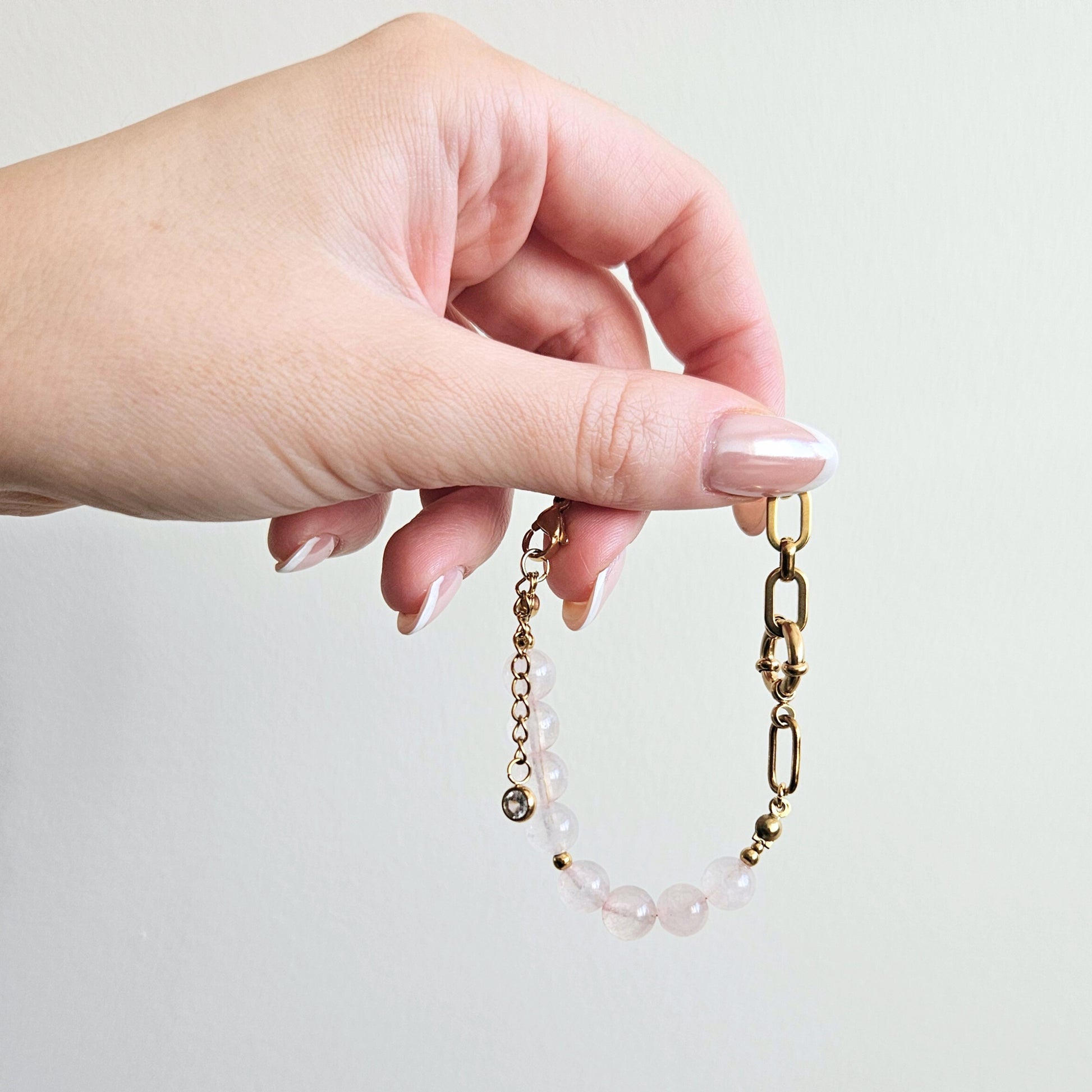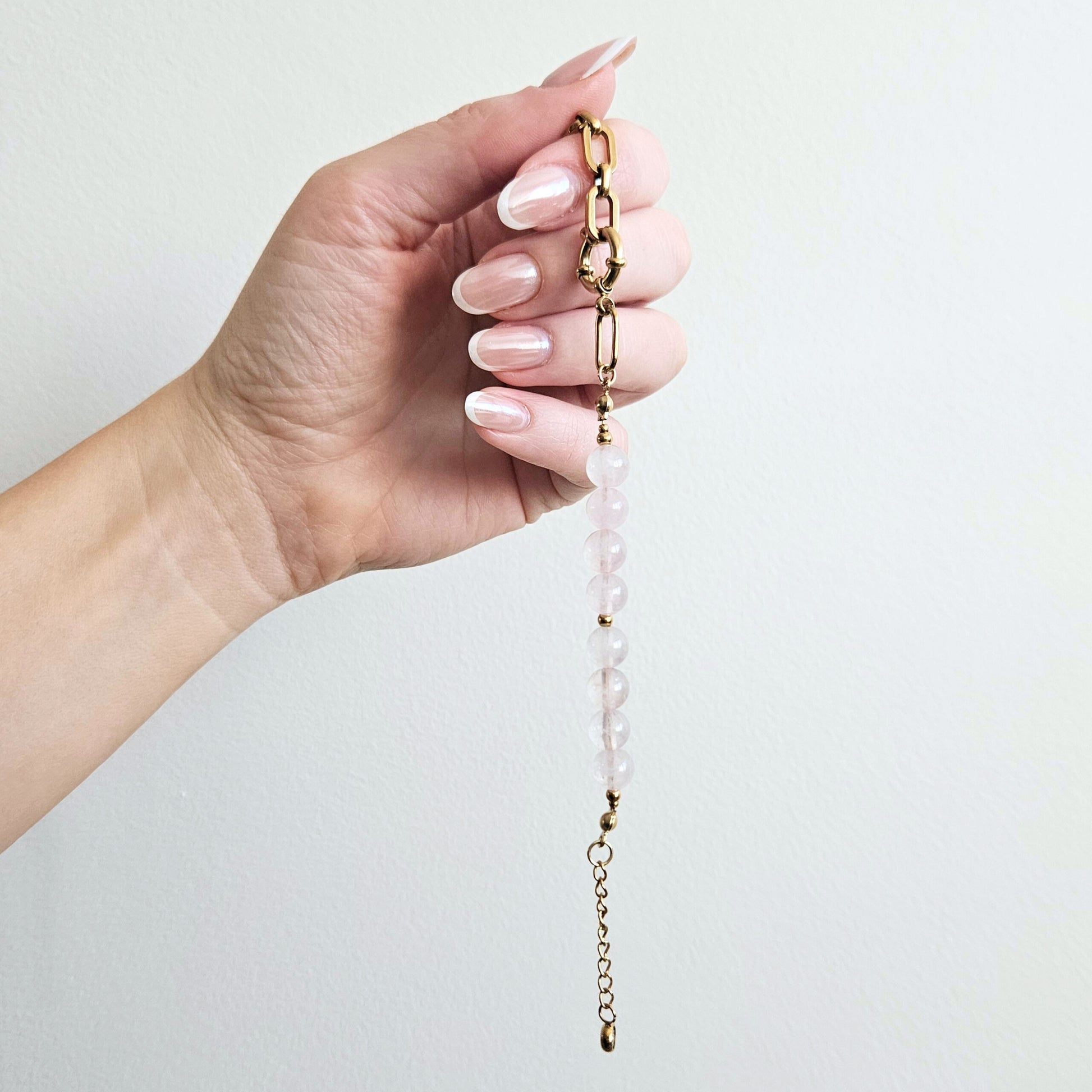 Bransoletka Luna Rosa to idealne uzupełnienie naszyjnika z kolekcji Gypsy Soul. Wykonana z kwarcu różowego – kamienia miłości – otula serce subtelną energią i delikatną harmonią. To talizman dla tych, którzy żyją w rytmie serca, z otwartością na piękno świata i głębię uczuć.