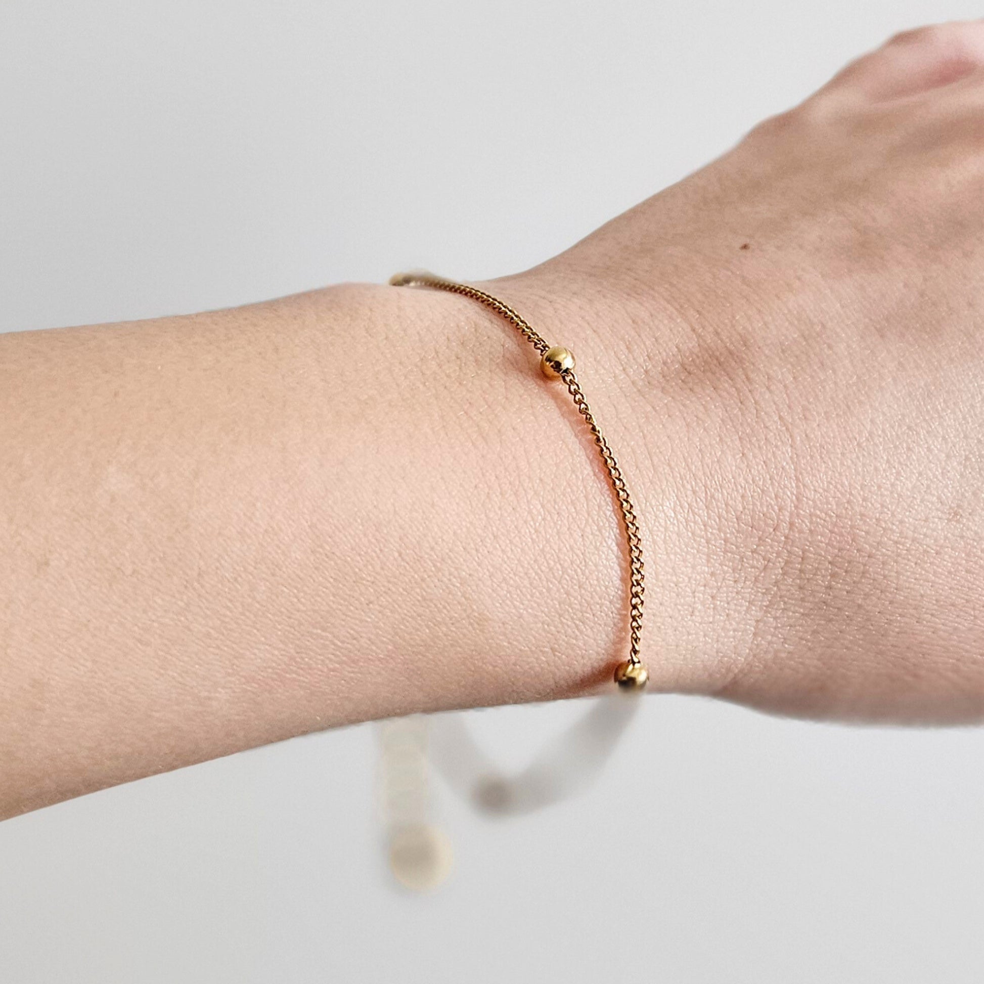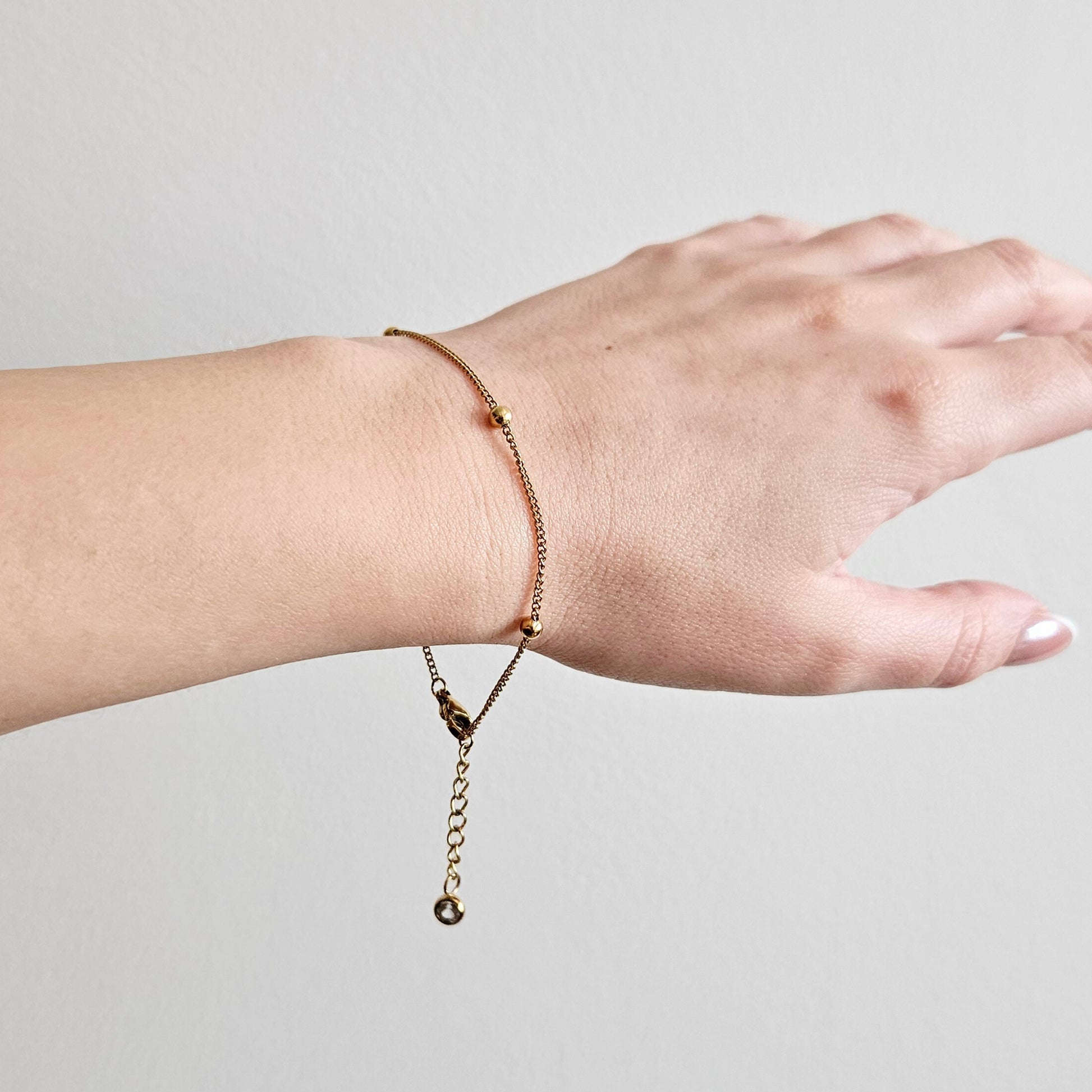 Bransoletka "Celestial" to minimalistyczny łańcuszek z delikatnymi kuleczkami, inspirowany blaskiem gwiazd. Lekki, subtelny i idealny do noszenia na co dzień lub jako elegancki akcent wieczornej stylizacji.