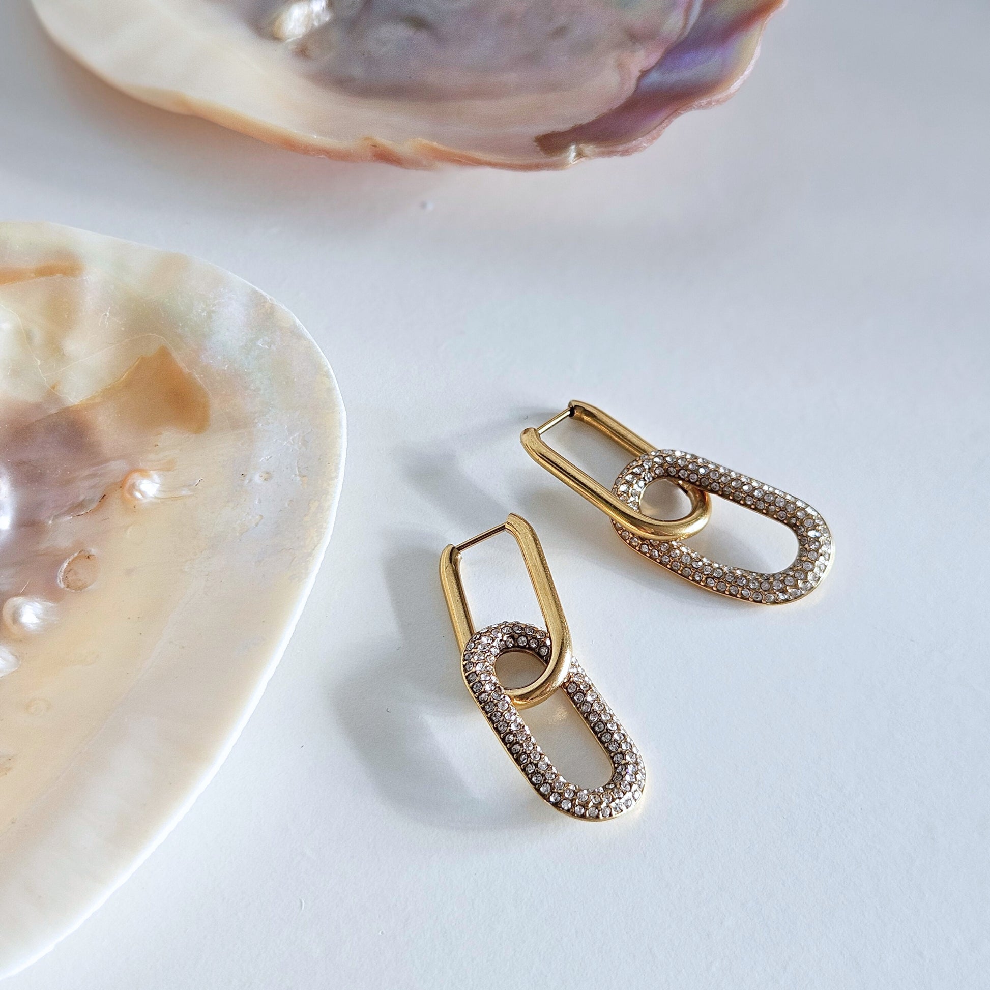 Składają się z dwóch owalnych elementów, które możesz nosić na dwa sposoby: pełna forma, z ozdobną częścią wysadzaną cyrkoniami, przyciąga spojrzenia i dodaje wieczorowego szyku, natomiast po jej zdjęciu pozostaje minimalistyczna baza – idealna na co dzień, lekka i uniwersalna.