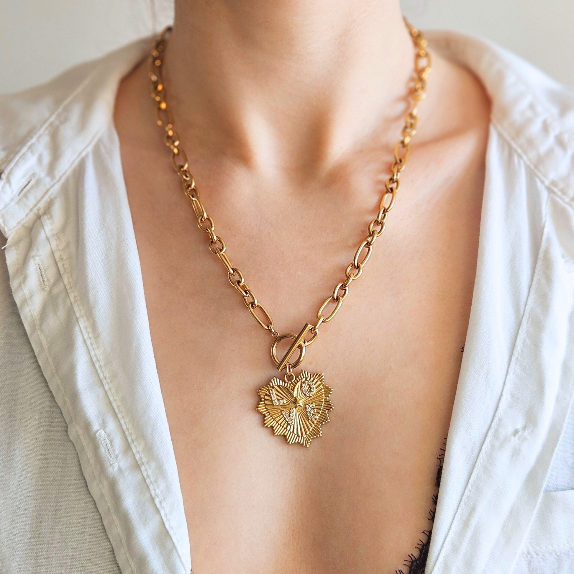 Ten naszyjnik to wyrazisty statement piece, który przyciąga spojrzenia. Masywne, owalne ogniwa łańcucha tworzą nowoczesną, modową formę, a zdobne zapięcie typu toggle ozdobione jest efektowną zawieszką w kształcie serca z wyraźnym napisem LOVE.