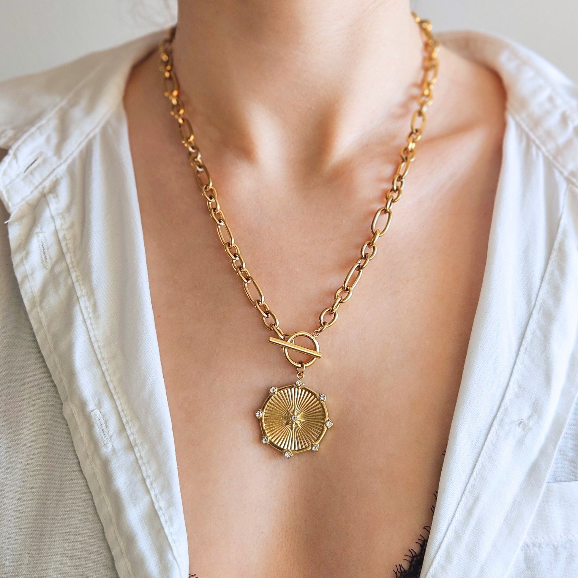 Ten naszyjnik to statement piece, który łączy masywne, owalne ogniwa łańcucha z wyjątkową, okrągłą zawieszką przypominającą tarczę zegara, zdobioną 8 cyrkoniami i gwiazdą w centrum. To połączenie geometrycznej formy z subtelnym, kosmicznym blaskiem tworzy biżuterię, która przyciąga spojrzenia i dodaje stylizacji wyjątkowego charakteru.