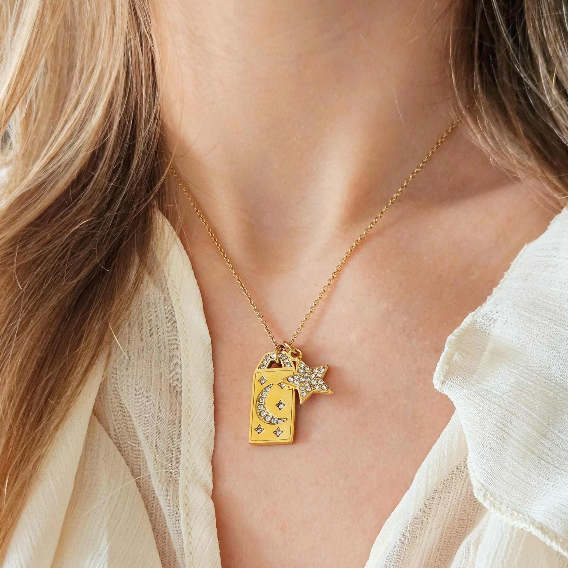 Naszyjnik „Moon & Star” to delikatna biżuteria inspirowana nocnym niebem. Księżyc – symbol kobiecej siły, intuicji i spokoju – spotyka się tu z gwiazdą, która przypomina o marzeniach, nadziei i świetle nawet w najciemniejszą noc.