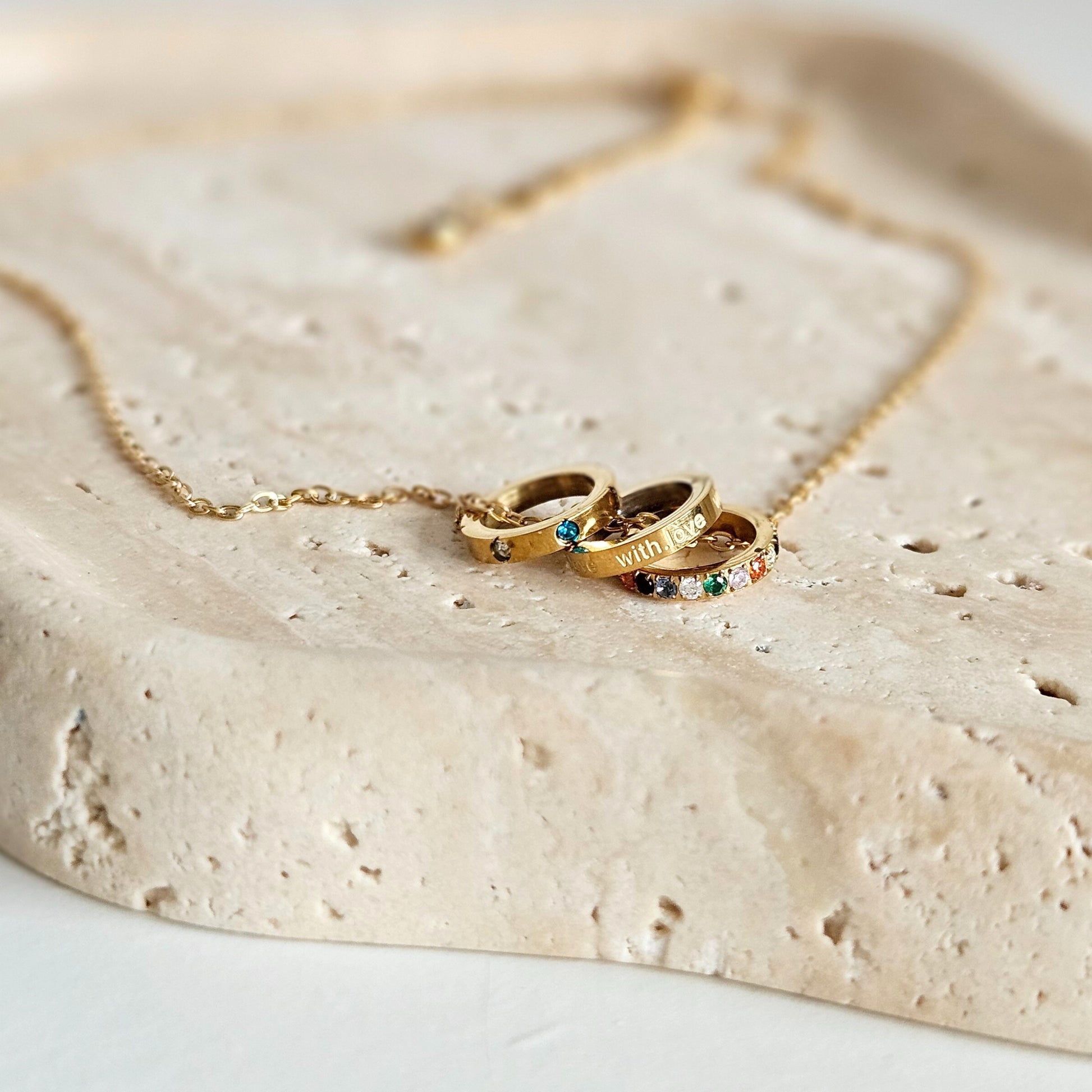 Naszyjnik Vive to minimalistyczny naszyjnik z klasycznym łańcuszkiem, ozdobiony trzema eleganckimi obrączkami. Pozłacany 18-karatowym złotem i wykończony cyrkoniami, dodaje subtelnego blasku zarówno codziennym, jak i eleganckim stylizacjom. Regulowana długość pozwala idealnie dopasować go do dekoltu.